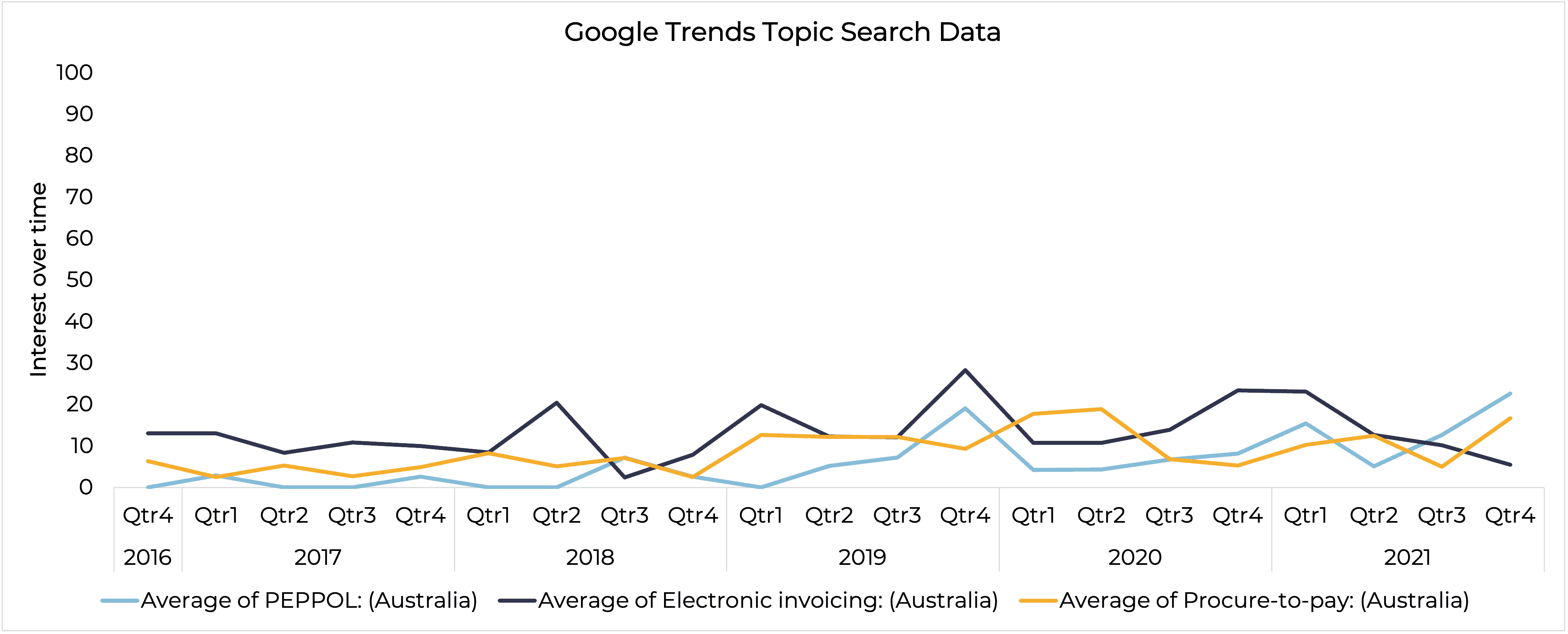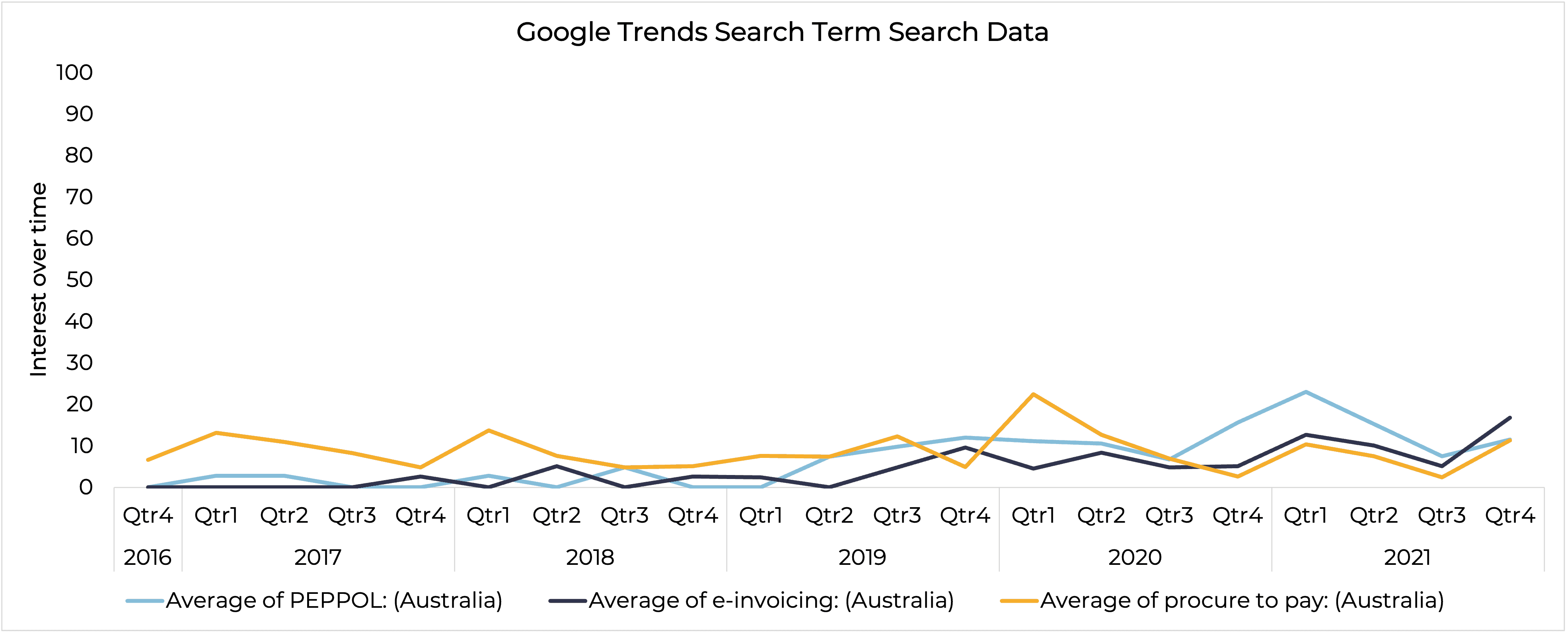 You can see from the data that interest in Peppol has been very low but has steadily picked up since Q1 2019 with e-invoicing tracking in a similar way. Interest peaked in Q1 this year which coincided with a number of e-invoice government mandates brought in by the Federal government. The inclusion of procure to pay gives you a good comparison point which is likely to be searched by a similar audience.