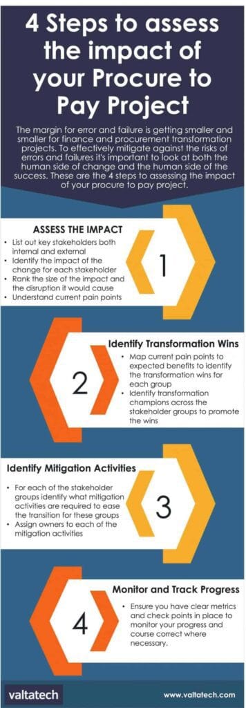 Given the size of the investment and the strategic importance of finance and procurement transformation projects succeeding, the margin for error and failure is getting smaller and smaller. To effectively mitigate against the risks that procure to pay solution projects introduce its important to look at both the human side of the change and the human side of the success. Identifying all the risks that may arise from those changes and mitigating them as best they can.