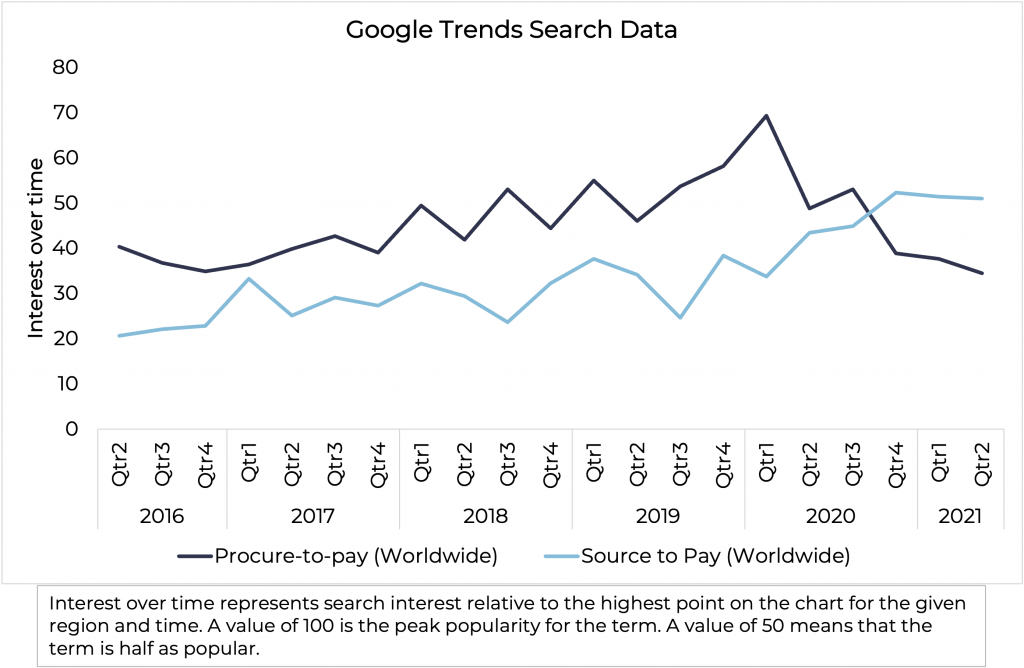 From Google Trends data analysis we can see that worldwide searches for Source to Pay have been trending upwards over the last 5 years and have actually overtaken procure to pay which highlights the increasing focus that businesses have not only ensuring that purchases are pre-approved and the invoice processing part is optimised but that they are focussed on looking at what they are buying, where they are buying them from and how much they are paying for them.