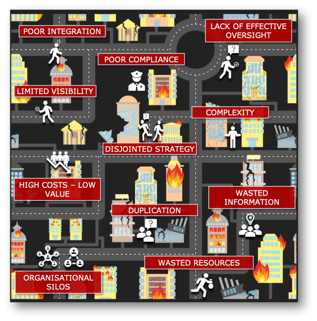 Businesses are ecosystems in themselves; they have dependencies, they have limitations, they have policies, and they have people connected to certain roles which could potentially be replaced by technology. I see businesses like cities, where siloed areas find themselves competing for resources and fighting to secure their own, as is shown in the below graphic.